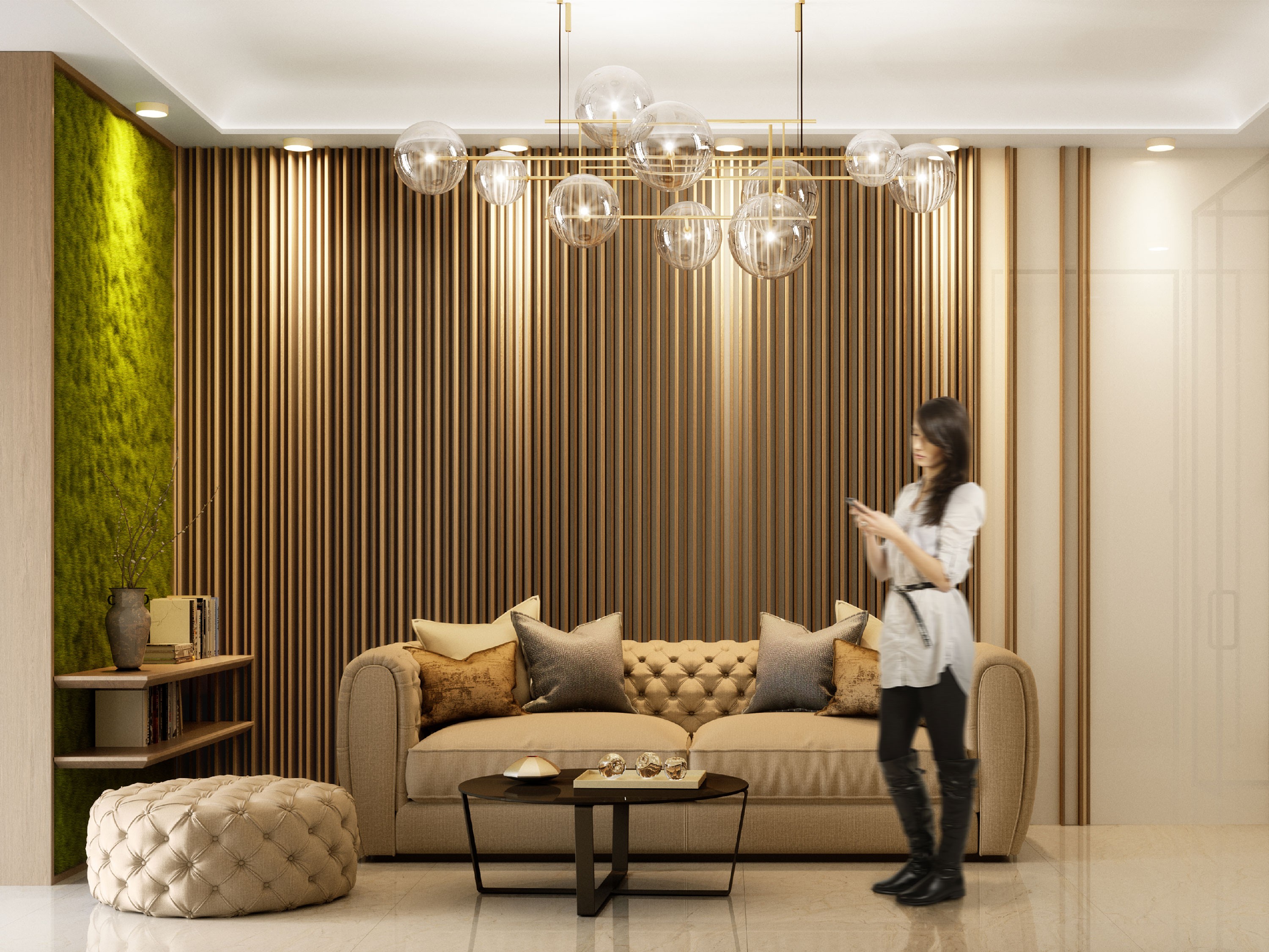 - Зелената стена е от естествен мъх в рамка от дърво (реално ще бъде МДФ ест. фурнир дъб с натурално масло )